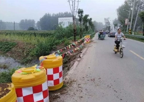 日前,阜南地区连降暴雨,阜南分局在道路巡查时发现X056南陶路李寨村K9+200处涵洞砖砌挡墙被暴雨冲毁,导致路肩出现8长、2.2米深的塌方路段,存在较大安全隐患。分局立即对该路段设置临时安全防护设施